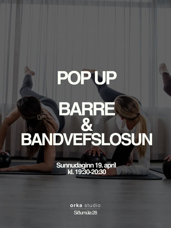 Skemmtileg POP UP æfing með eigendum Orka Studio. Byrjum kvöldið á kröftugum 30 mín barre tíma með Nadiu. Seinni hálftíminn verður bandvefslosun þar sem við endum á slökun með Guðrúnu. Hressing, Kristall+, kaffi, Nuun steinefni og sölt í boði á æfingunni. Mikilvægt að mæta í þægilegum æfingafötum og með vatnsbrúsa. Lítil kríli ekki velkomin með að þessu sinni.
